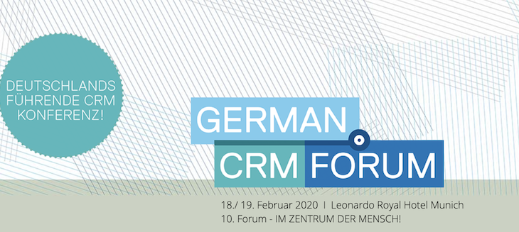 Startdatum: 26. Februar 2019Enddatum: 27. Februar 2019Uhrzeit: 0:00 - 0:00Ort: Leonardo Royal Hotel Munich, Moosacher Str. 90, 80809 MünchenMit, laut Veranstalter, 300 Teilnehmenden, darunter CRM-Verantwortliche aus Unternehmen wie BMW, Sixt oder mymuesli, ist das German CRM Forum seit Jahren die größte CRM-Konferenz im deutschsprachigen Raum und damit der relevanteste Treffpunkt für CRM-Verantwortliche. In diesem Jahr findet die Veranstaltung unter dem Motto „Make your Customers smile!“ in München statt. -